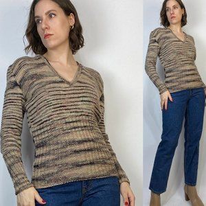 Vintage 70s hand knit space dye sweater with cinched waist and v neck! Love the skin flattering colours in chestnut, beige, mushroom taupe and peach with flecks of metallic gold! Major missoni vibes! No label.