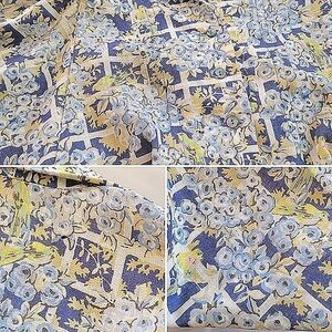 • Light blue, green, and cream floral and bird pattern on white lattice gate / dark blue background
