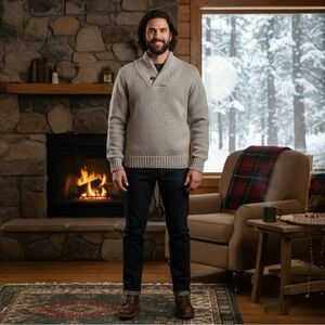 Vtg 80s Eddie Bauer Wool Shawl Collar Sweater Size Large Neutral Cabin Cottage