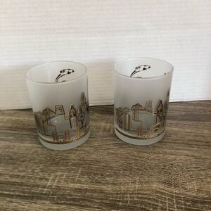 Two vintage souvenir whiskey rocks glasses featuring Universal Studios. Gold and black graphics on a frosted glass. These date to the 90s I believe.