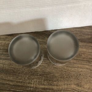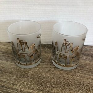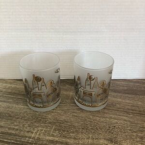 Two vintage souvenir whiskey rocks glasses featuring Universal Studios. Gold and black graphics on a frosted glass. These date to the 90s I believe.