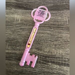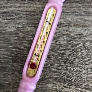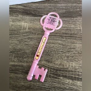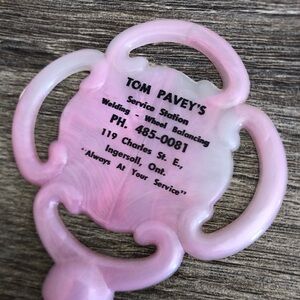 Tom Lacey’s Service Station, Ingersoll Ontario advertising thermometer. Pink lucite key shape with name on the top and thermometer in the shank.