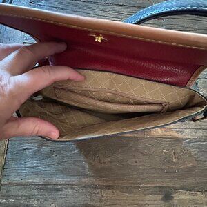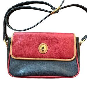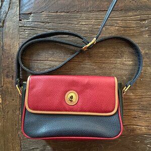 Classic vintage Alfred Sung crossbody bag in a striking tri-color design. This leather purse features a bold red flap, sleek black body, and gold-tone trim and hardware for a timeless statement look.