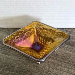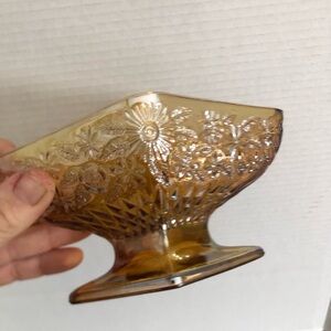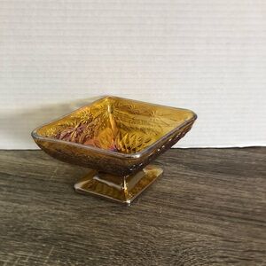 Adorable amber glass dish. Intricate floral design. Perfect for candies or decor. Could also be used to hold a tea light or votive candle.
