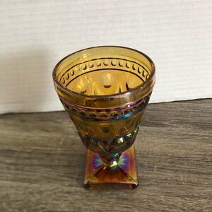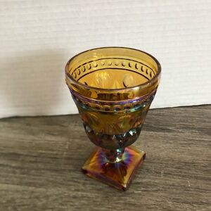 Lovely amber glass goblet with a vintage charm. Perfect for adding a touch of color to your home decor. Made by Indiana Glass. Amber Carnival glass is absolutely stunning with a lovely amber base and rainbow applied detail. Makes it super shiny and pretty to look at! I believe this would have originally been a sherry glass.