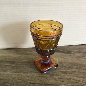 Lovely amber glass goblet with a vintage charm. Perfect for adding a touch of color to your home decor. Made by Indiana Glass. Amber Carnival glass is absolutely stunning with a lovely amber base and rainbow applied detail. Makes it super shiny and pretty to look at! I believe this would have originally been a sherry glass.