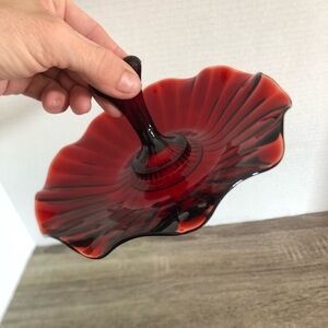 Beautiful dark red glass dish with a scalloped edge and central handle. Perfect for serving or display. Would make a wonderful tidbit tray or somewhere to place your change at the end of the day.