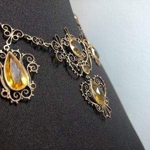Vtg. Art Deco Filigree Czech Glass Necklace. Amazing Necklace, Excellent Vintage Condition (EVC). Citrine colored Czech Glass set in a (likely) copper filigree setting. Each stone is its own work of art.