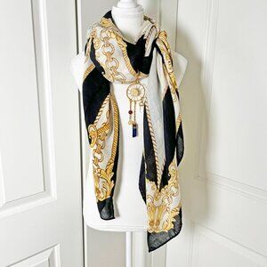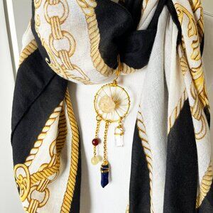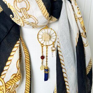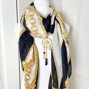 Add a touch of Art Noveau to your wardrobe with this Black and Gold Scarf featuring a bold gold chain and rope print, paired with a convertible gemstone dreamcatcher pendant.