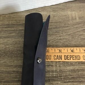 Silver metal screwdriver with a blue pouch. Includes multiple attachments. Flashlight integrated into the flashlight for lighting up your work area.