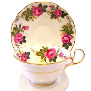 Vintage Aynsley bone china of white and wreath of pink of roses that circle saucer and teacup. Anysley is a designer that makes exquisite beautiful quality china pieces that sells for high dollar & as time goes on is not very available let alone find. Their pieces usually fall in the vintage,antique category.