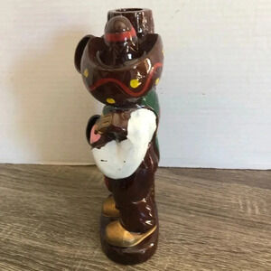 This little Mexican man is playing a guitar and is standing next to what looks like a cactus. The cactus has an open top, I presume for bar tools, but I’m not 100% sure. There are two shot glasses included that look like little mugs. Spots for more but only two included. All made from ceramic red ware and hand painted. Made in Japan.