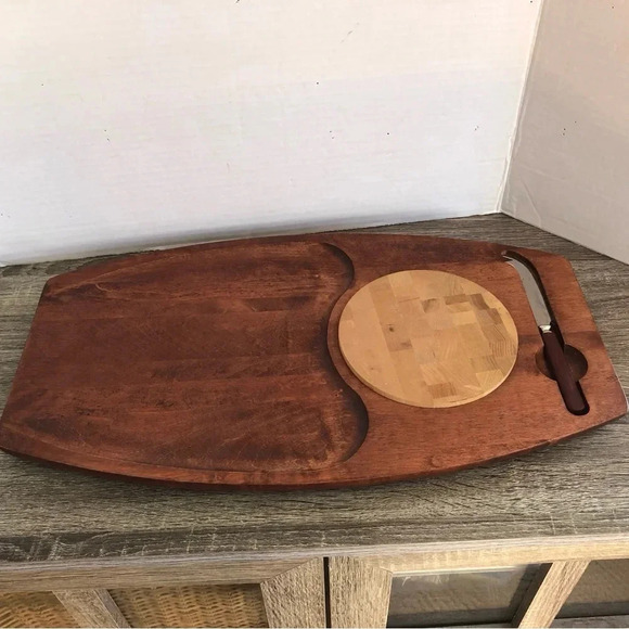 Large wooden off-rectangular cutting board with cheese knife and insert checkerboard pattern round cutting board which I presume you could take out and use on its own. Note: currently stuck in there so I don’t know if it’s taped or actually glued.