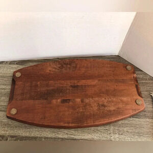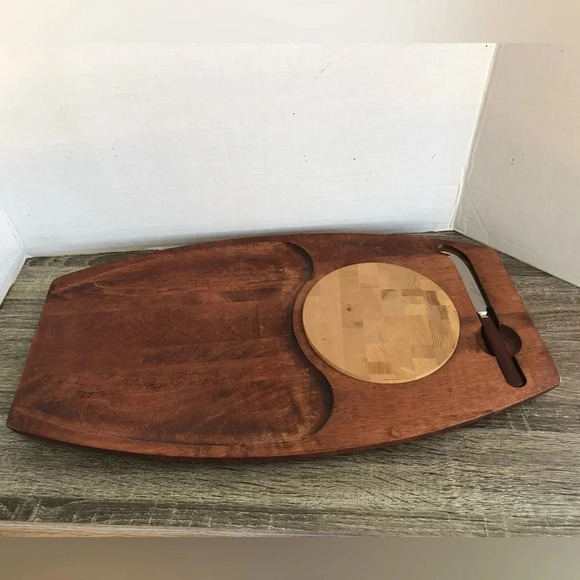 Large wooden off-rectangular cutting board with cheese knife and insert checkerboard pattern round cutting board which I presume you could take out and use on its own. Note: currently stuck in there so I don’t know if it’s taped or actually glued.