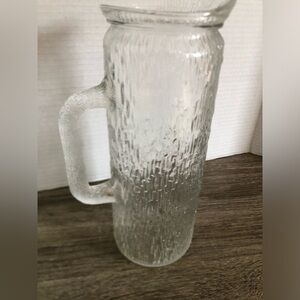 Elegant textured glass pitcher perfect for serving beverages. Its clear design adds a touch of sophistication to any dining setting. Bark/ice textured glass with a sturdy handle and sleek lines. This design is not common, it may have been a limited edition version or something, I’m honestly not sure because I couldn’t find another like it.
