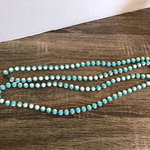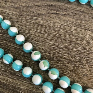 Teal blue beads with white painted accents, fairly long at 26.5” long.