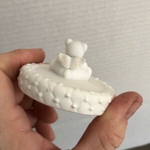 Quilted patterned top with a teddy atop. I believe this was a part of the Cherished Teddies line. White bisque round trinket box. I believe this may have been intended for teeth. Reads March and aquamarine with the aquamarine rhinestone in between.