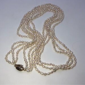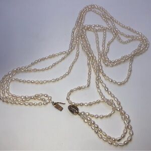 Vintage Real Pearl Necklace - 3 strand Multi Strand extra long necklace - pearls are I. Excellent condition no wear to nacre. freshwater biwa rice pearls.
