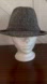 Chic tweed fedora hat with a classic design. Features a mix of grey, black, white, and gold specks.