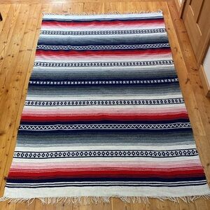My aunt passed this on to me to post for her. It’s from Tijuana circa late 70s (1978, 1979). Love the colourway on it. The little pink stripe mixed in is my Favorite. Measures 56” x 87”. Laundered and ready to use.
