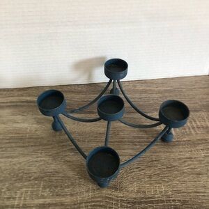 This vintage 90s metal candle holder features a striking navy blue finish with a hint of gold, adding a touch of elegance to any space. Its minimalist design with multiple arms creates a captivating symmetrical pattern, perfect for a dinner table centrepiece.