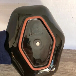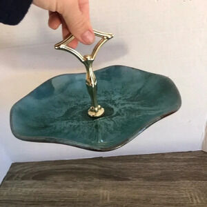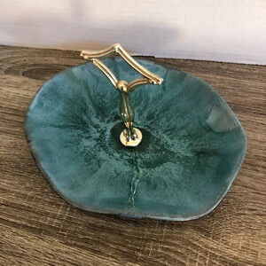 One tiered handled tray made by Blue Mountain Pottery in Collingwood Ontario. Classic black and teal drip glaze pottery.