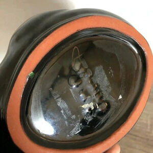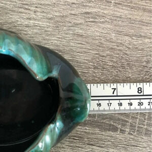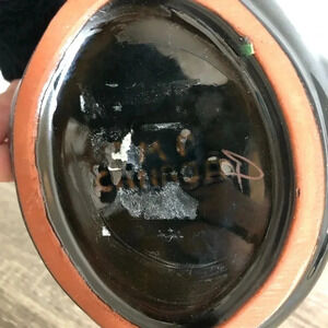 MCM green and black drip glaze on a Redware base. Made by Blue Mountain Pottery. Some marks on the bottom but you don’t see that when it’s on a shelf. No chips or cracks. Light crazing.