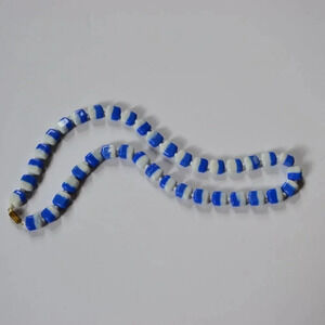 Blue and white square/rectangular beads with smaller rounded white beads in between.