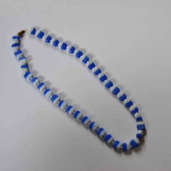 Blue and white square/rectangular beads with smaller rounded white beads in between.