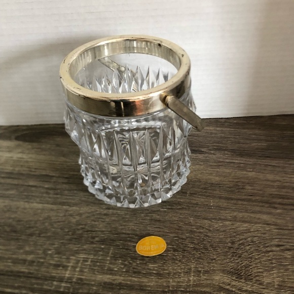 Heavy lead crystal ice bucket with silver rim and handle. Note: tongs not included.
