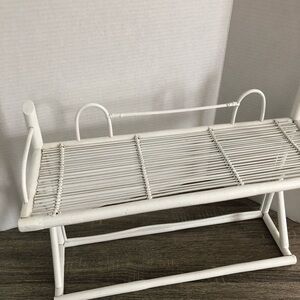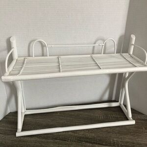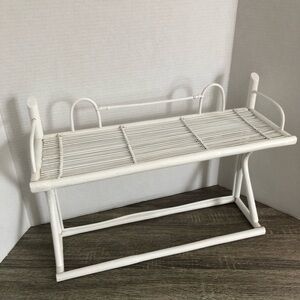 Enhance your bathroom with this bohemian style white bath shelf. Perfect for organizing essentials with style. Towel bar on the bottom would fit two hand towels side by side perfectly, or one as shown.