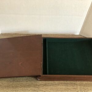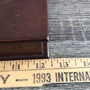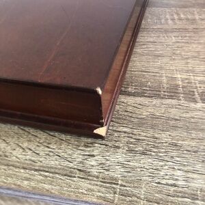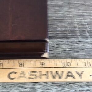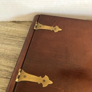 Keep your items organized with this elegant brown wooden hinged box. Featuring a classic design with brass accents, it's perfect for any home office. Looks like a book. I believe the small slot is for pens or pencils and the larger section may be for documents but you could store anything you like in this really.