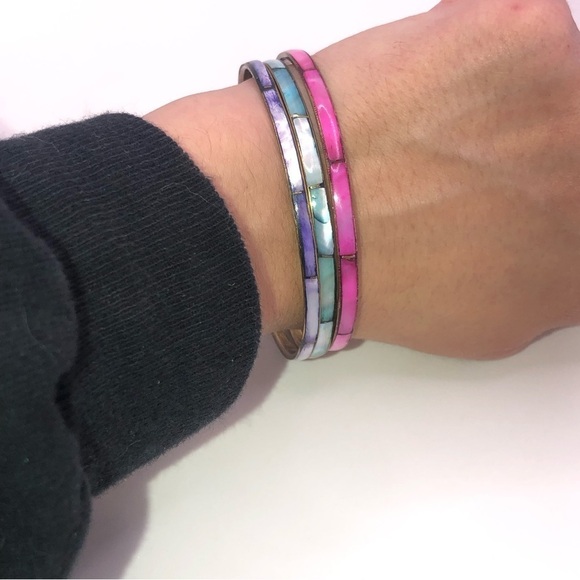 Vintage retro brass bangles with dyed pink light blue and dark blue mother of Pearl inlay panels.