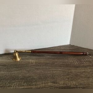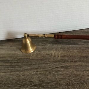 Elegant brass candle snuffer with long wooden handle. Perfect for safely extinguishing candles.