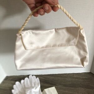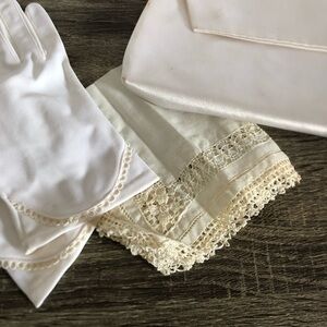 Chic white gloves paired with a matching clutch and complete with a handkerchief! Perfect for a bride’s big day!