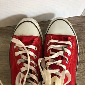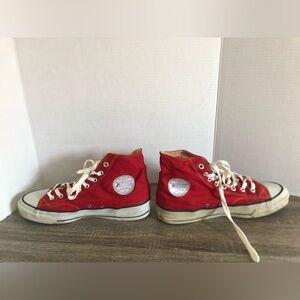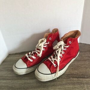 Stylish red high-top sneakers featuring white laces and a classic design. Perfect for casual wear. Size 12, these are vintage from the 70’s/80’s so please see measurements in photos.