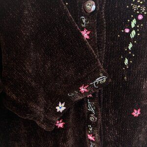 grannycore, cottagecore, embroidered, beadwork, bohemian, floral, botanical, 90s, cottagecore, eclectic, boho chic, hippie, grandmacore, granny goodness, twee, vintage chenille cardigan, brown embroidered sweater, beaded cardigan women’s L, cozy grannycore knit, cottagecore embroidered cardigan, boho chic layering sweater, sparkly chenille cardigan, eclectic vintage cardigan, botanical embroidery sweater, 90s vintage cardigan