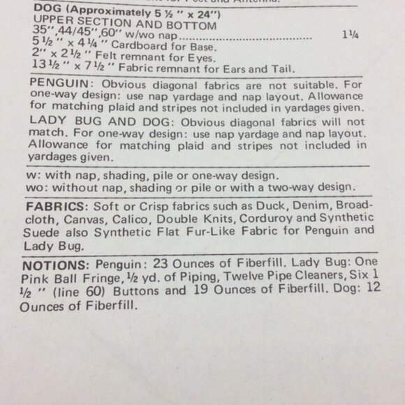 Butterick pattern 3958 is to make animals stuffed with fiverfill. Penguin- felt eye, beak, and base; tri-color. Lady Bug- felt eyes, mouth feet, and antenna; purchased piping strip; button trim and pom-pom. Dog- felt eyes and lashes; bi-color.