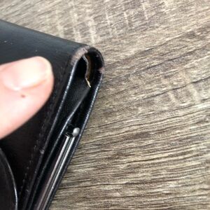Black soft leather wallet with many compartments, bill fold and change spot. Kiss lock on the change compartment. The front is just a simple push in button. Made in Canada.