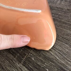 Made likely in the mid 20th century. Lovely peach glazed pieces, these would typically go to a set, there would be 4 and then a bowl in the middle. Can easily use these as they are with a bowl in between and they will look adorable still. Leaf sort of pattern. Made by California Pottery in the USA. Each is about 10” from tip to tip. Height is about 1 1/2”.