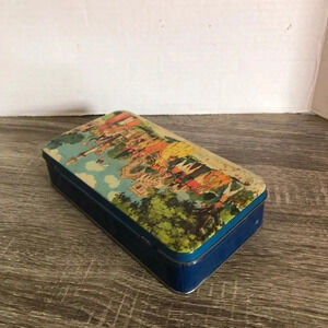 Walters Palm Toffee tin. Decorated hinged lid of a courtyard scene and reads “Dickensian Memories”. Based on research this is likely from the 1940s.