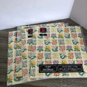 New old stock gift wrap. Made by Carlton Cards. Floral pattern with “for your wedding” written on it. All identical print. Four packages total. Each package has 2 sheets. Each sheet is 20” x 30”.