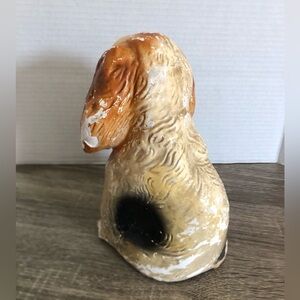 Adorable Chalkware dog figurine in tan and black. Perfect for pet lovers and collectors. This is a prize giveaway from a carnival much like one would get plush today.