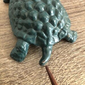 Charming green turtle paperweight. Perfect for adding a touch of nature to your desk. Made from heavy cast metal.