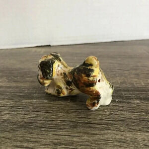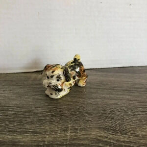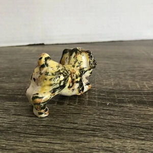 Cute little miniature dog with a multicoloured sponge type paint job. Likely hand painted. Marked on the bottom made in Japan.
