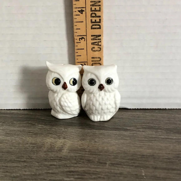 White anthropomorphic owl ceramic salt and pepper shakers. Vintage likely from the 80’s. Unmarked.