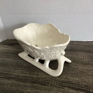 Ivory coloured ceramic sleigh planter. Holly raised pattern.