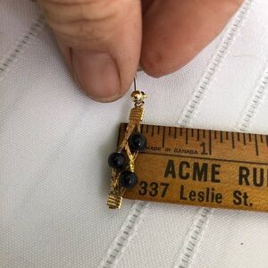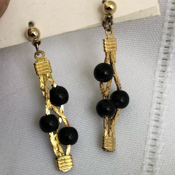 Elegant gold tone chain earrings with black bead accents. Perfect for any occasion.