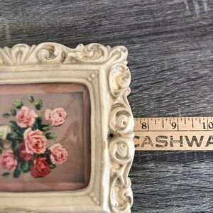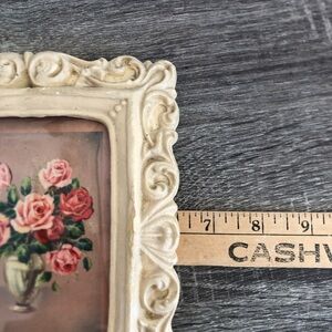 Enhance your home decor with this elegant cream picture frame featuring beautiful floral art. Perfect for adding a touch of sophistication to any room. Interesting convex plastic(?) “glass” on top of the floral print. Made by Lilycraft Products. Chalkware frame cream tone with intricate scroll design.