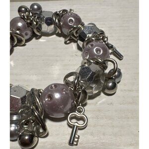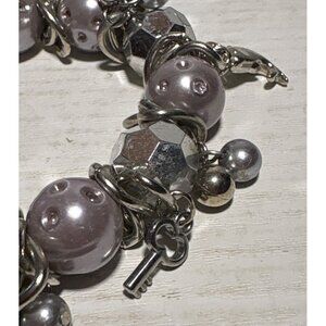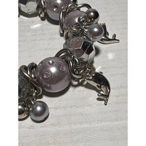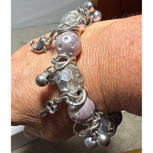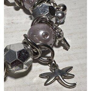 Vtg Charm Bracelet Silver Lavender Beaded Dolphin Starfish Key Accents Stretch